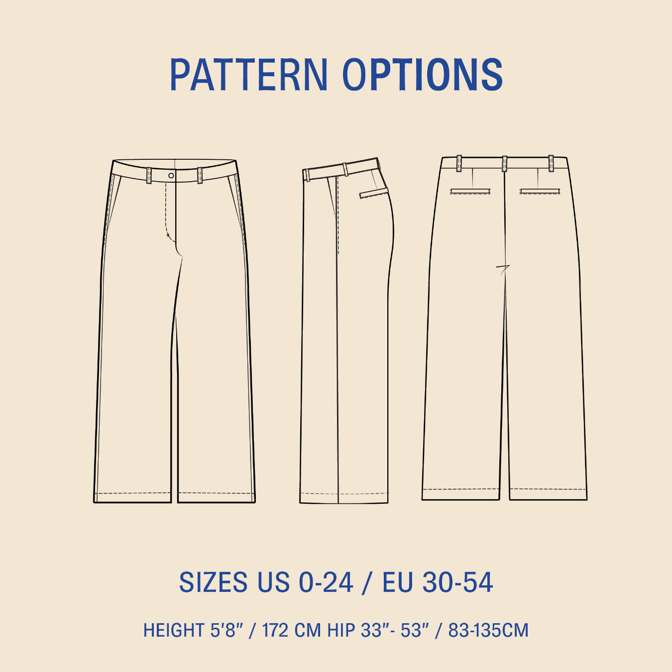 The Hepburn Pants Sewing Pattern is a perfect combination of sophistication and comfort. Make the Hepburn Pants with woven fabric with a little stretch, such as cotton twill, sateen, denim, or linen. The pants have a contoured waistband, a zipper fly, slanting pockets, back darts, and back welt pockets. They are fitted from the waist to the hip and have wide legs from the hips to the floor. The pattern includes sizes US 0–24 / EURO 30–54.