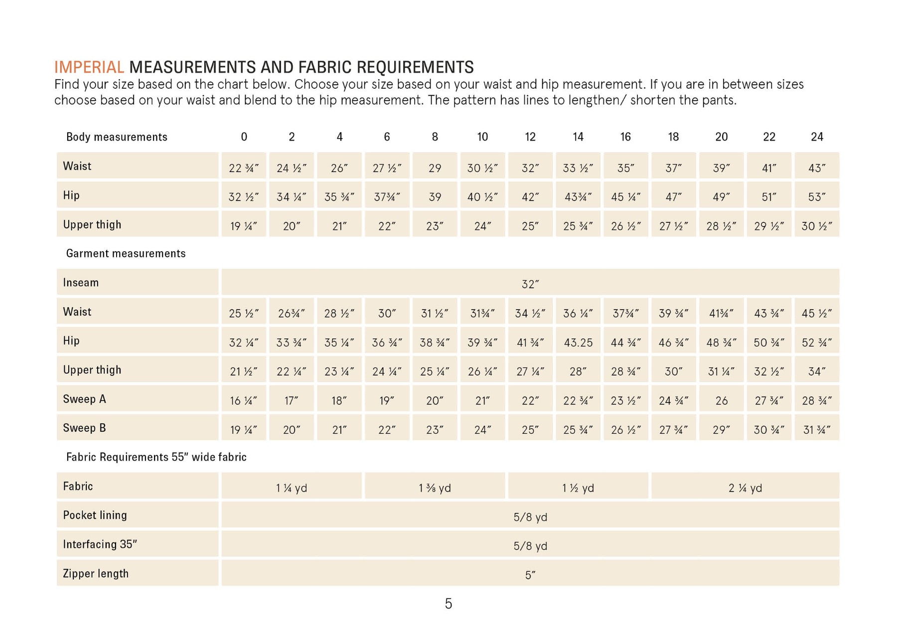 Flip through the images to find fabric requirements and measurements for the Pants Sewing Pattern.