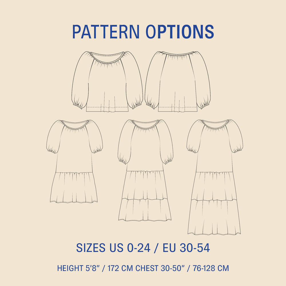 Make the Moira dress sewing pattern with 1/2, 3/4, or 7/8-length sleeves, and create a blouse or a tiered Dress in mini, midi, or maxi lengths.