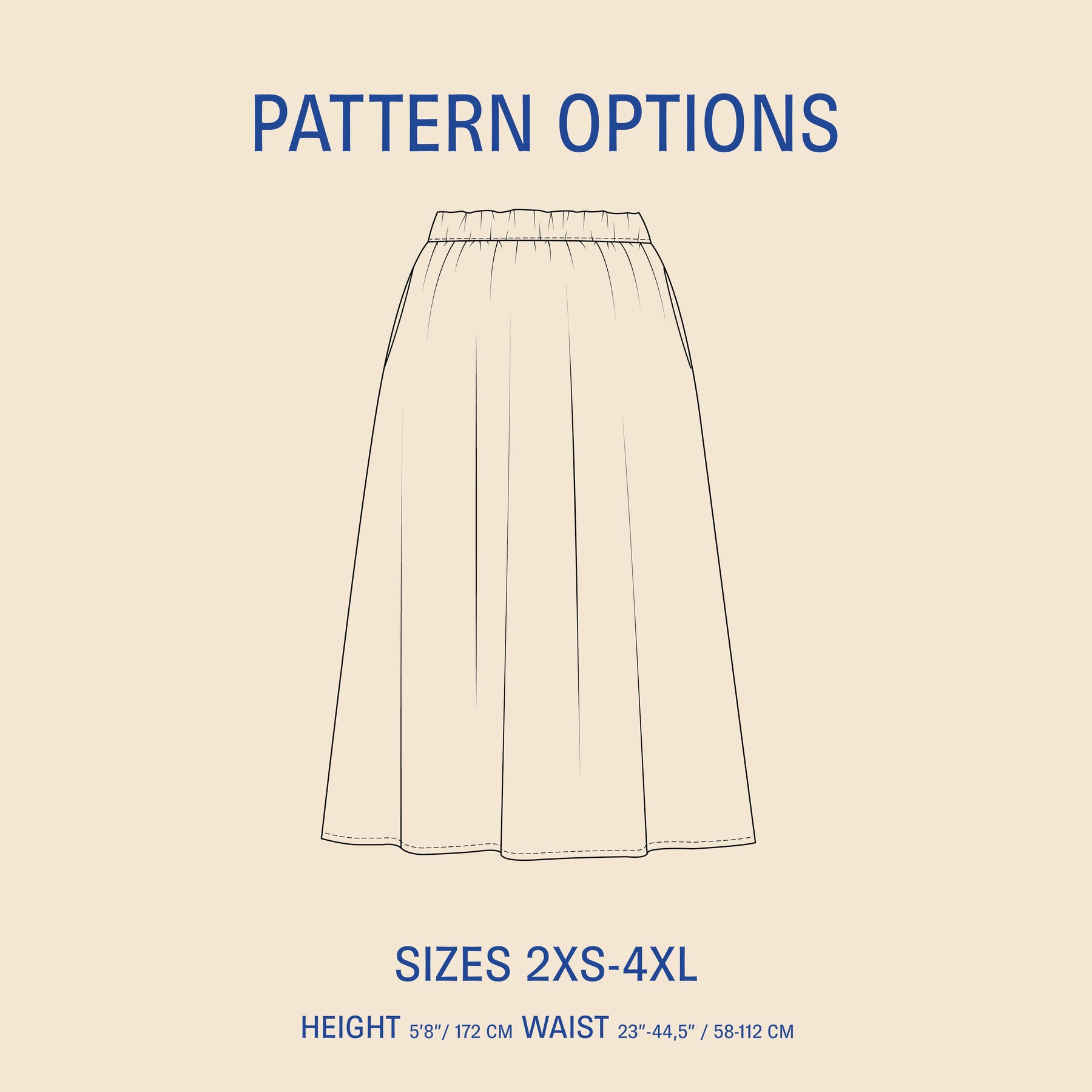 - Garment Features: Elastic waistline, Long skirt, Elastic Waistband, Inseam Pockets, Option to cut on the straight grain and on the bias