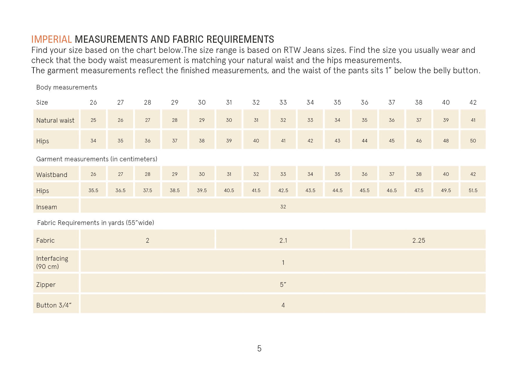 Flip through the images to find fabric requirements and measurements for the Cargo Pants sewing pattern.