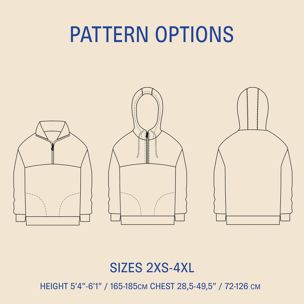 Zip-Up Sweater sewing pattern- The perfect everyday sweater that is comfortable and casual yet still looks put together. Pair it with a thick, cozy fleece for a laid-back fall or winter look, or sew it in a sleek, athletic knit for a sporty feel. This sweater can be made all in one fabric or mix and match fabrics to make a cool color-blocked sweater. The Zip-Up sweater features a sporty quarter-zip in the front, side pockets, and ribbed cuffs at the wrists and waistband. Choose the standup collar or the contoured hood with drawstrings to make it your own.